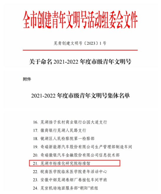 日前,共青团芜湖市委员会发布公告,全市30家单位荣获“2021-2022年度市级青年文明号”称号,芜湖市标准化研究院标准馆名列其中。