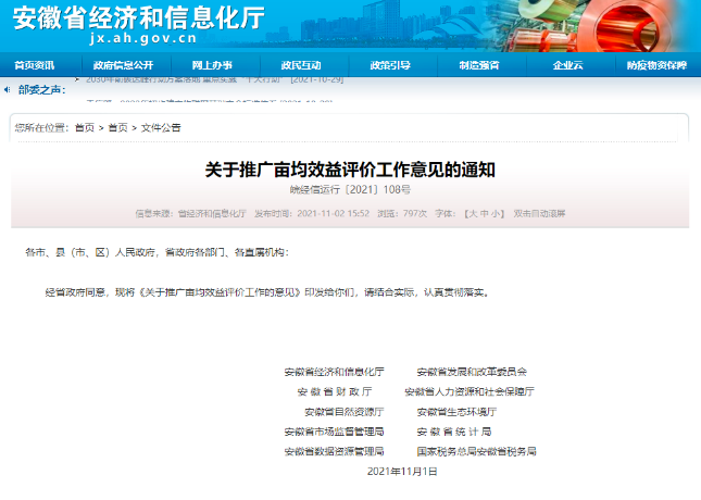 实际上,在安徽省级启动之前,省内马鞍山、宣城等地已经先行先试,并很快取得了成效。2018年,马鞍山率先启动试点,以亩均税收为重点,以智能、绿色、品牌、研发等反映企业综合素质的指标为加分项,对企业实施综合评价。2021年,马鞍山亩均税收达到17.4万元,同比增长17.9%;亩均营业收入达到372.5万元,同比增长26%。这就是亩均论英雄带来的强劲推动作用,也进一步佐证了安徽全省开展亩均论英雄改革的必要性。要么不做,要做就做最好。为保障全省亩均论英雄改革的走向深入,安徽打出了“五个一”组合拳。一是制定一个改革文件。2021年11月,安徽省经信厅会同省发展改革委等10部门共同印发了《关于推广亩均效益评价工作的意见》(以下简称《意见》),拉开了安徽亩均论英雄改革工作全面启动的序幕。《意见》既充分借鉴先发地区有益经验,又注重结合安徽实际;既考虑宏观统筹调度,又注重调动市县积极性,不搞整齐划一,突出目标导向、问题导向、效果导向,为各地提供了一份具有很强指导性、针对性和可操作性行动指南。