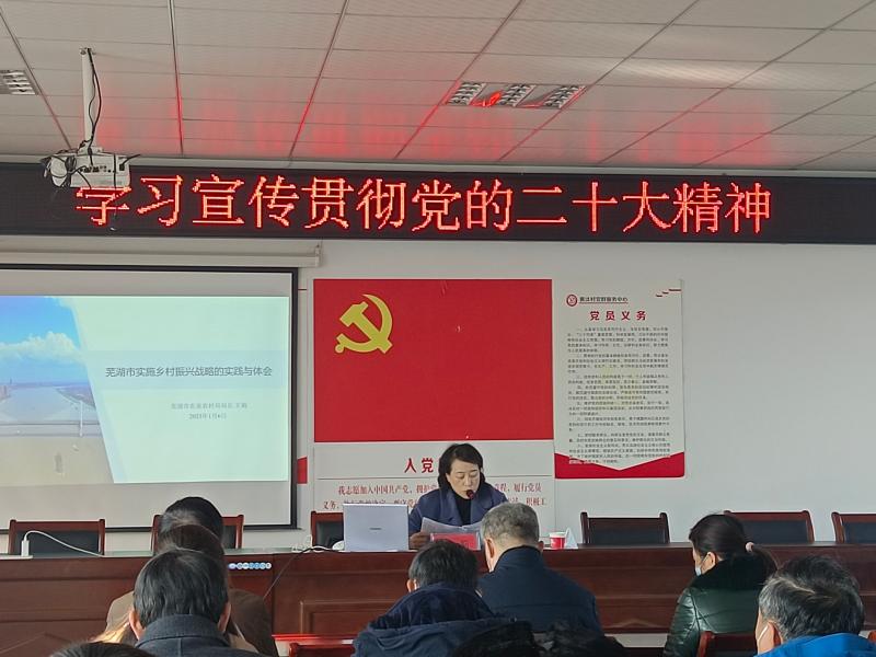 慰问结束后,局党组书记、局长王莉给黄汰村党总支党员、村干部及群众代表们宣讲党的二十大精神及我市实施乡村振兴战略具体实践,从深刻领会党的二十大重大意义、准确把握党的二十大精神实质、迅速兴起学习宣传贯彻党的二十大精神热潮等三个方面,对党的二十大精神作了系统阐述和解读。并且用深入浅出的语言带领大家学习领会二十大报告中“4处成就、2处问题、1节集中部署、30处涉及‘三农’的工作部署”,用生动案例阐述我市近年来乡村振兴实践与成效,要求黄汰村党员干部们要全面贯彻习近平新时代中国特色社会主义思想,认真学习宣传贯彻党的二十大精神,坚持把群众愿望与心声作为工作的第一信号,顺应广大农民建设美丽家园、过上美好生活的愿景期盼,真心实意为群众解决生产生活中的实际困难,继续踔厉奋发,勇毅前行,努力改善群众生产生活条件,在党委、政府的支持下,全面推进乡村振兴,加快推进农业农村现代化,建设好宜居宜业和美黄汰村。
