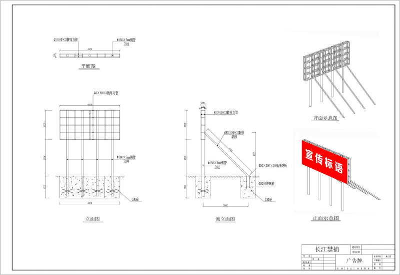 宣传牌整体采用钢结构焊接,所有焊点应做防锈处理,牌柱基础采用混凝土预埋,深度1.5米。宣传牌结构为钢结构箱式,镀锌板底层,宣传牌后方需用镀锌钢管斜撑。宣传牌采用布胶质封边。由于宣传牌安装位置特殊,无施工便道,机械设备无法进入,因此所有施工材料需要人工二次搬运。