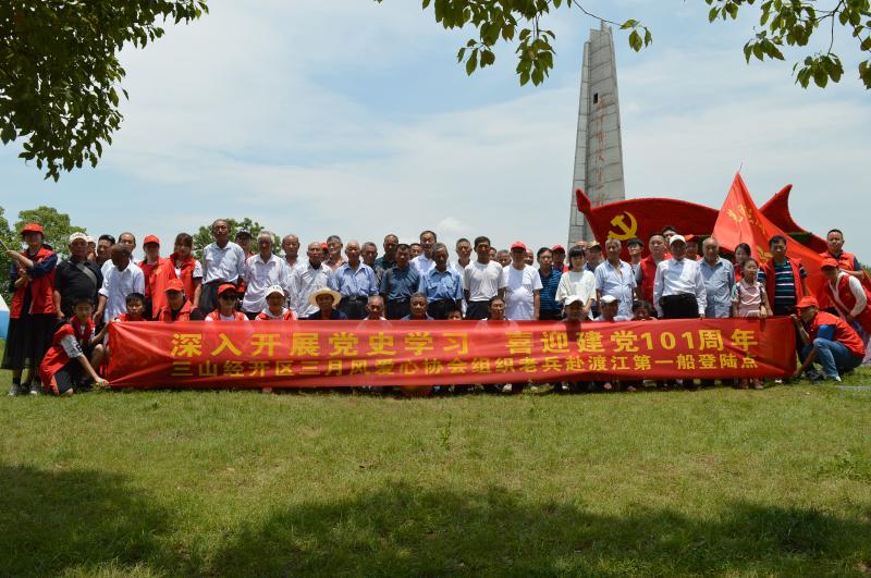 6月25日,芜湖市三山经济开发区龙湖街道退役军人服务站与三月风爱心协会党支部联合开展“深入开展党史学习,喜迎建党101周年”主题活动,组织70位退役老兵、三月风爱心协会党员和志愿者来到 “渡江战役第一船登陆点”—— 繁昌区板子矶,寻访红色足迹,重温革命历史,传承红色精神,向中国共产党建党101周年献礼。